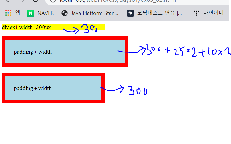 <div> width(350px)=320(너비)+20(패)+0(마)+10(보) </div>