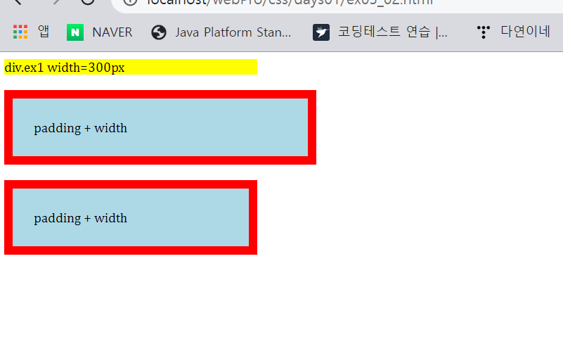 ex03은 ex02와 동일하나 box-sizing: border-box; 을 추가하니 총 너비가 300에서 변하지 않았다.