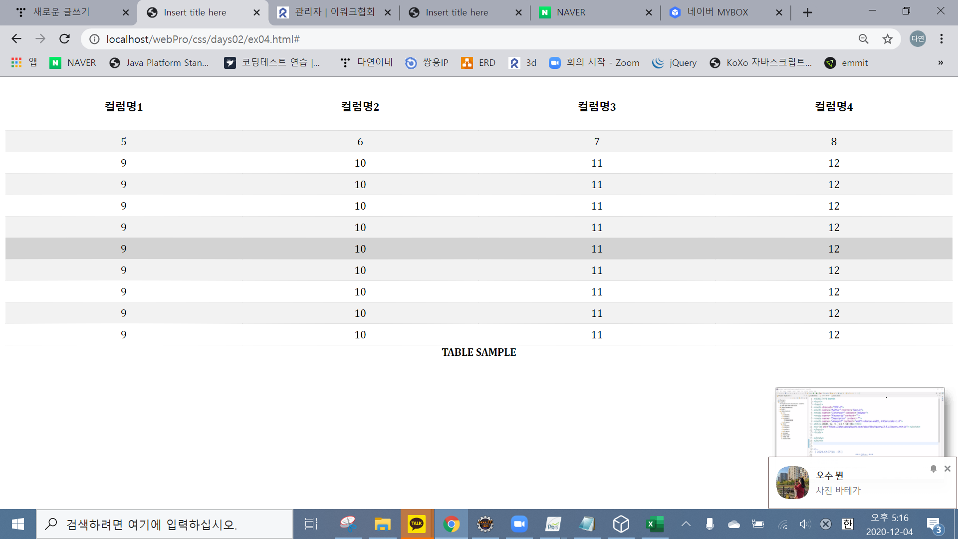<caption >table sample</caption> <!-- 크기 지정 없으면 내용물에 따라 크기가 지정됨 -->