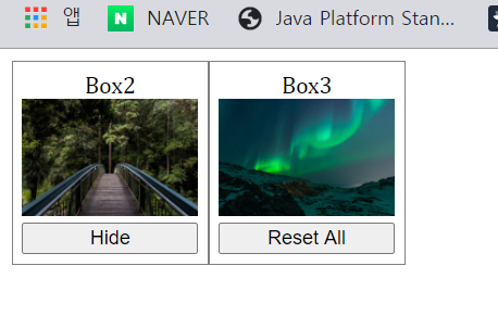 visibility : hidden이 적용되어 있는 버튼을 누르면 box2가 사라지며 있던 공간이 남는다.