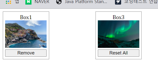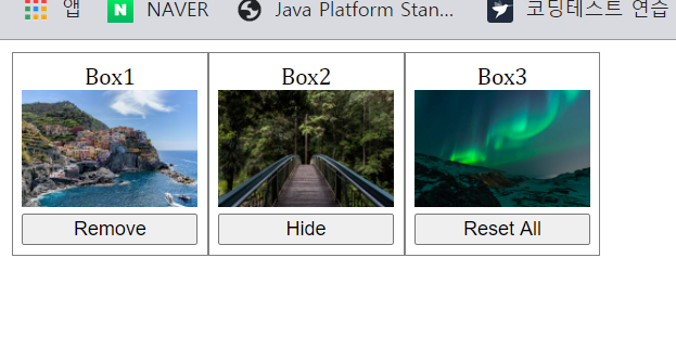 display : none이 적용되어 있는 버튼을 누르면 box1이 사라지며 공간조차 남지 않는다.