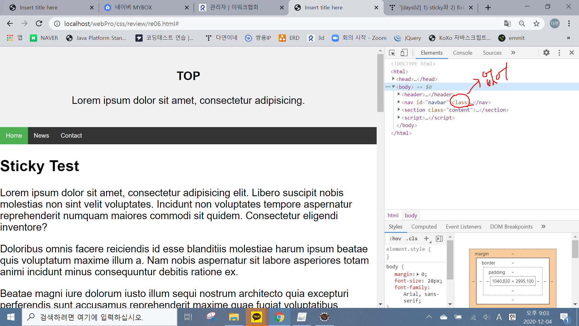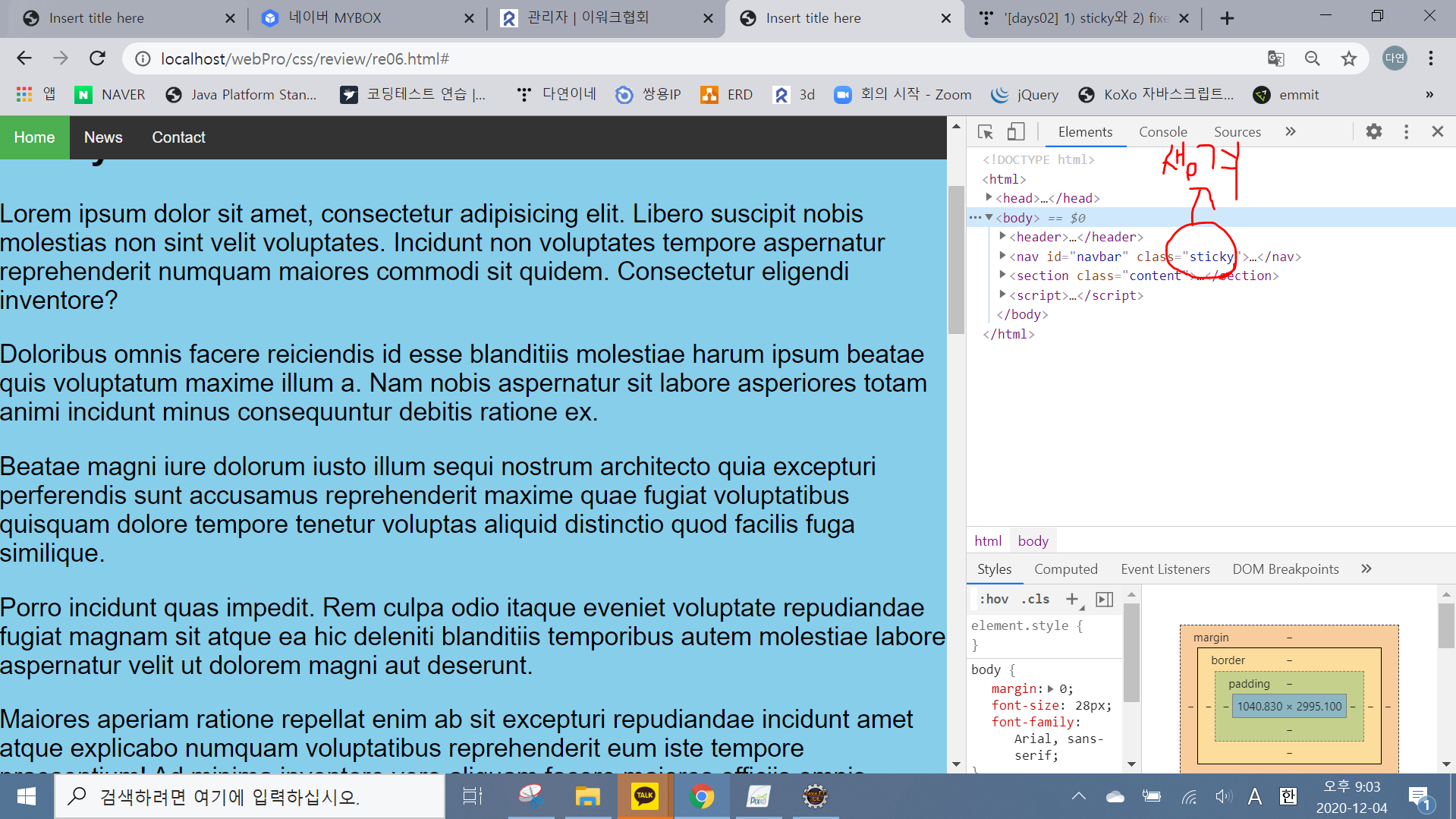 content의 앞의 요소는 navbar이니까 거기가서 클래스명 sticky를 줘보자