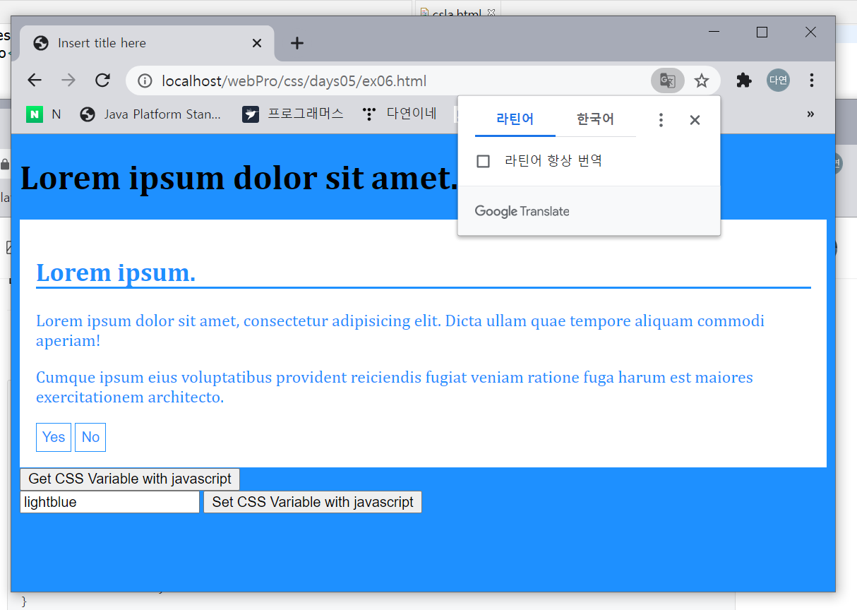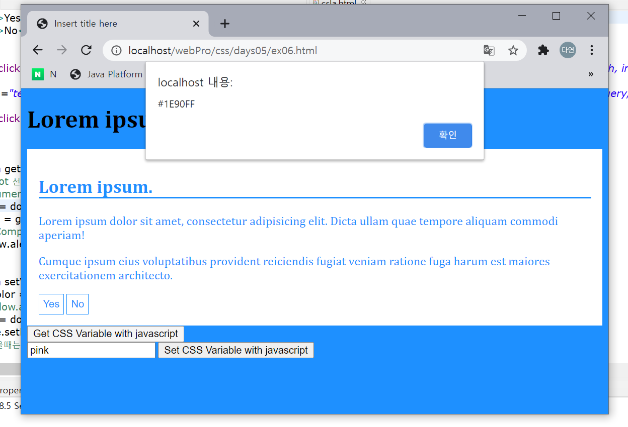 위의 Get CSS Variable ~ 버튼을 누르면 (텍스트와 상관없이) [현재 배경색인 #1E90FF]가 alert으로 뜬다.