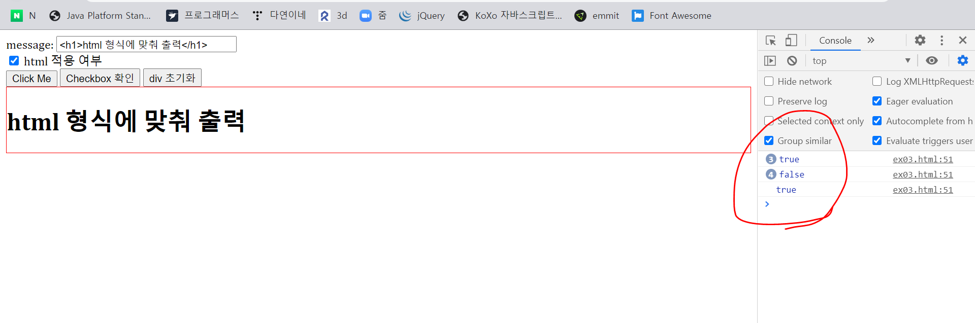 html 적용 여부가 체크되어 있으면 true를, 해제되어 있으면 false를 출력한다.
