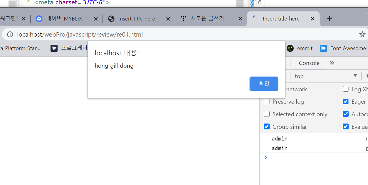 alert("hong"+" "+"gill dong"); //js에서도 사용 가능