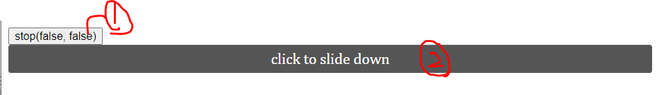 2번 버튼을 누르면 숨겨진 div가 내려오고, 그 도중 1번 버튼을 누르면 내려오던 것이 멈춘다.