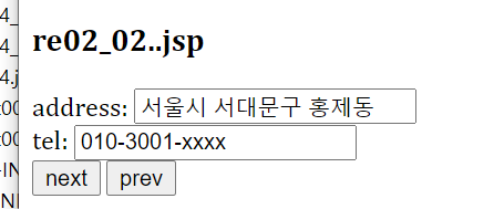 re02_02에서는 그 받은 값들을 숨기고, addr과 tel을 입력받아 re02_finish.jsp로 넘겨준다.