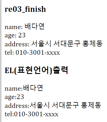 re02_finish.jsp에서는 name, age, addrm tel을 모두 넘겨받아 출력한다. (숨겨진 name, age까지도)