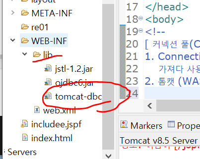 ㄱ. WEB-INF > lib tomcat-dbcp.jar 추가 (jar파일 위치 : 나는 c드라이브 apache-tomcat 속 lib 속에 존재)