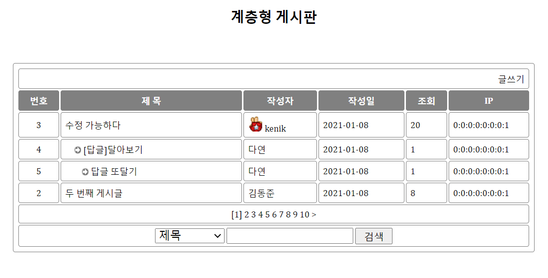| [days10] 이론 - 답글을 달 수 있는 게시판(==계층형 게시판==답변형 게시판) (1) | 2021.01.07 |