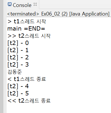 t1스레드와 t2스레드는 서로 독립적으로 실행되기 때문에 t1스레드가 종료되어도 t2는 계속된다.