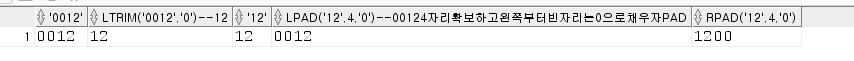 ,lpad('12',4,'0') --0012 4자리 확보하고 왼쪽부터 빈자리는 0으로 채우자 pad