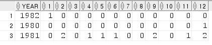 pivot (count(month) for month in(1,2,3,4,5,6,7,8,9,10,11,12) );