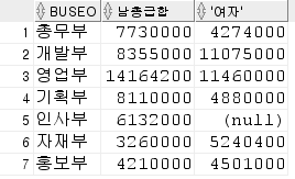 13) 부서별 - 남자 총 급여합 / 여자 총 급여합
