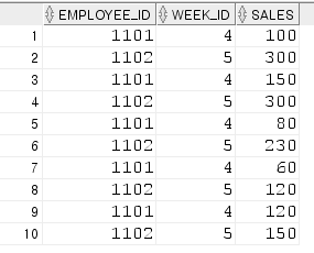 select employee_id, week_id, sales_mon, sales_tue, sales_wed,