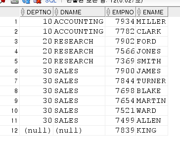 from emp e join dept d on e.deptno(+) = d.deptno; --right outer join : 왼쪽에 +
