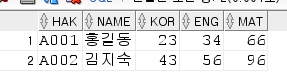 insert into t_score values('A001', '홍길동', 23,34,66 );