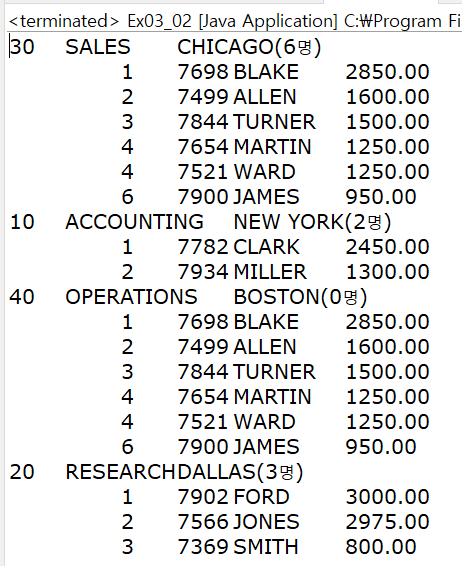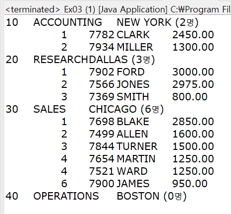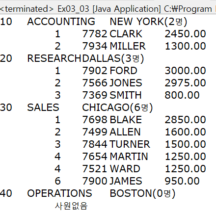 부서 순서가 이상하고, 40번부서가 0명인데 30번 부서 사람들이 출력되었다.